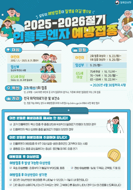 국가 예방접종 지원 대상은 ▲생후 6개월부터 13세까지의 어린이 ▲임신부 ▲65세 이상 어르신이며, 위탁의료기관 47개소에서 무료로 접종을 받을 수 있다.