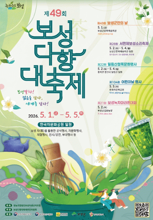 한편, ‘보성다향대축제’는 문화체육관광부 ‘로컬100(Local 100)’에 선정된 대한민국 대표 문화관광축제로, 축제 기간인 5월 1일부터 5일까지 △보성군민의 날, △서편제보성소리축제, △일림산철쭉문화행사, △어린이날 행사, △녹차마라톤대회 등이 함께 개최된다.