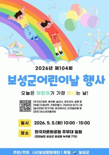 한편, 제49회 보성다향대축제는 5월 1일부터 5일까지 한국차문화공원과 보성차밭 일원에서 개최되며, 어린이날 행사 외에도 보성군민의 날, 서편제보성소리축제, 일림산철쭉문화행사, 녹차마라톤대회 등 다양한 프로그램이 함께 운영된다.