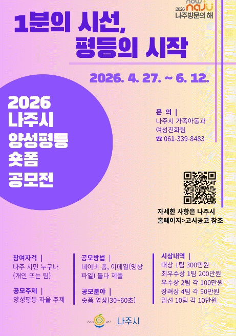 나주시는 ‘2026년 나주시 양성평등 숏폼 영상 공모전’을 추진한다고 28일 밝혔다.