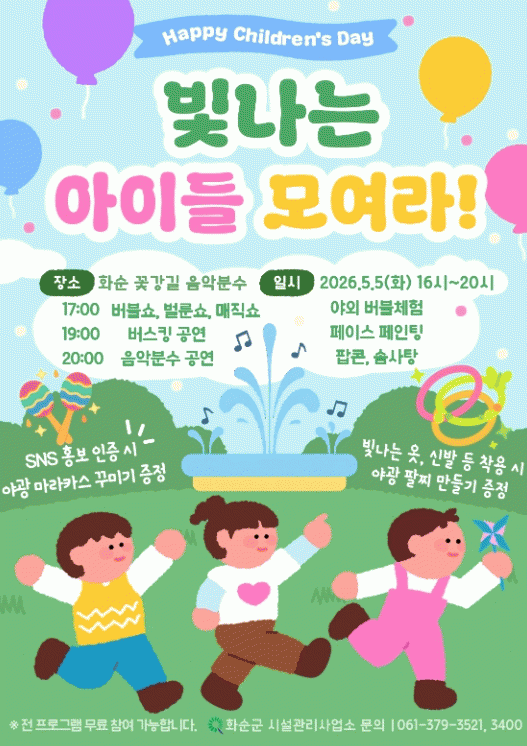 윤재관 홍보소통담당관은 “어린이날을 맞아 아이들이 마음껏 뛰놀고 웃을 수 있는 하루가 되길 바란다”라며, “어린이날 축제에 남녀노소 전 세대가 함께하길 기대한다”라고 밝혔다.
