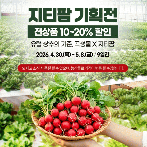 이번 기획전은 곡성몰 입점 업체인 지티팜의 주력 상품인 유럽채소를 홍보하기 위한 할인 행사로, 소비자에게 신선하고 품질 높은 농산물을 합리적인 가격에 제공하고 입점 업체의 온라인 판로 확대를 지원하기 위해 마련됐다.
